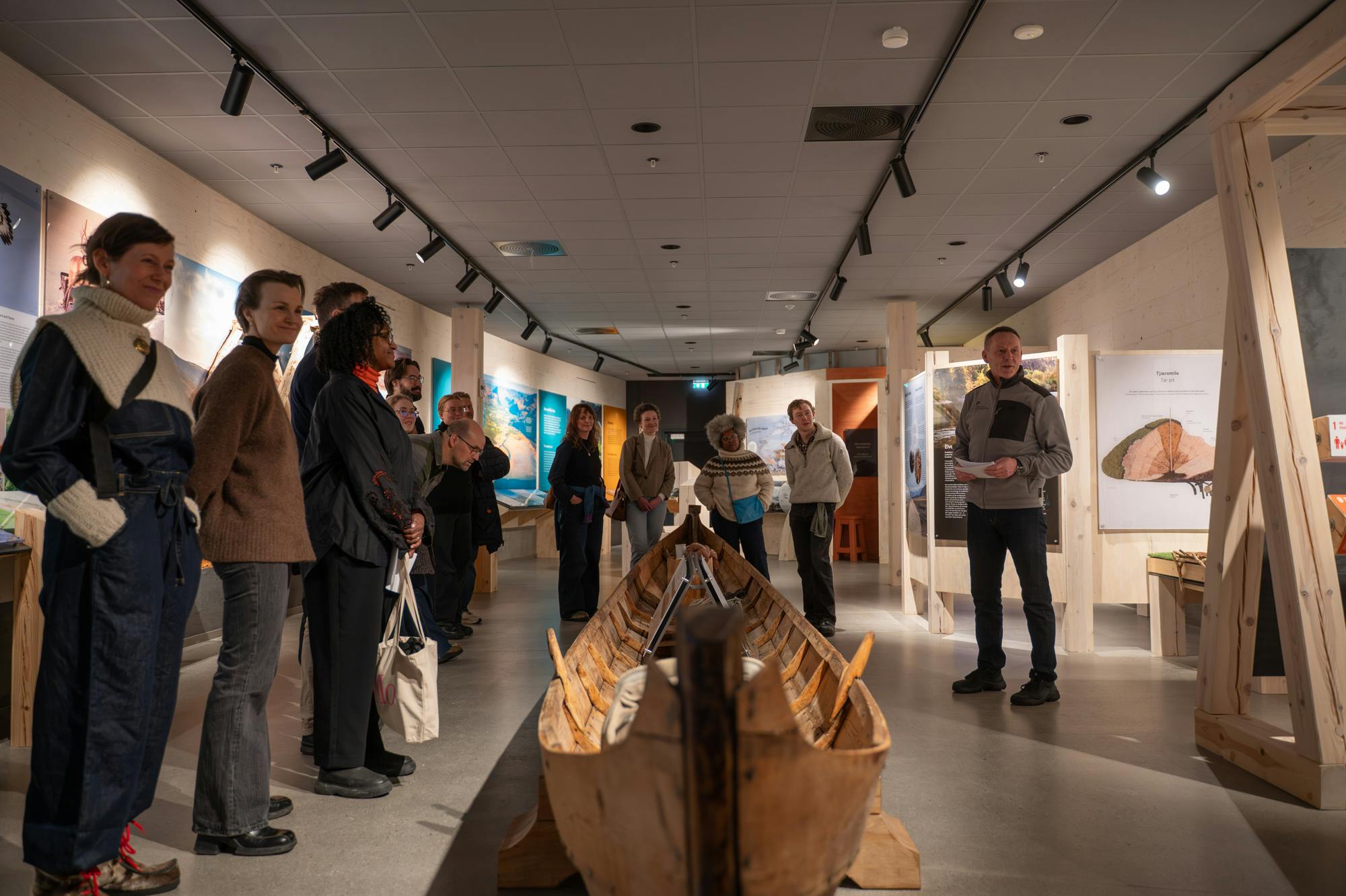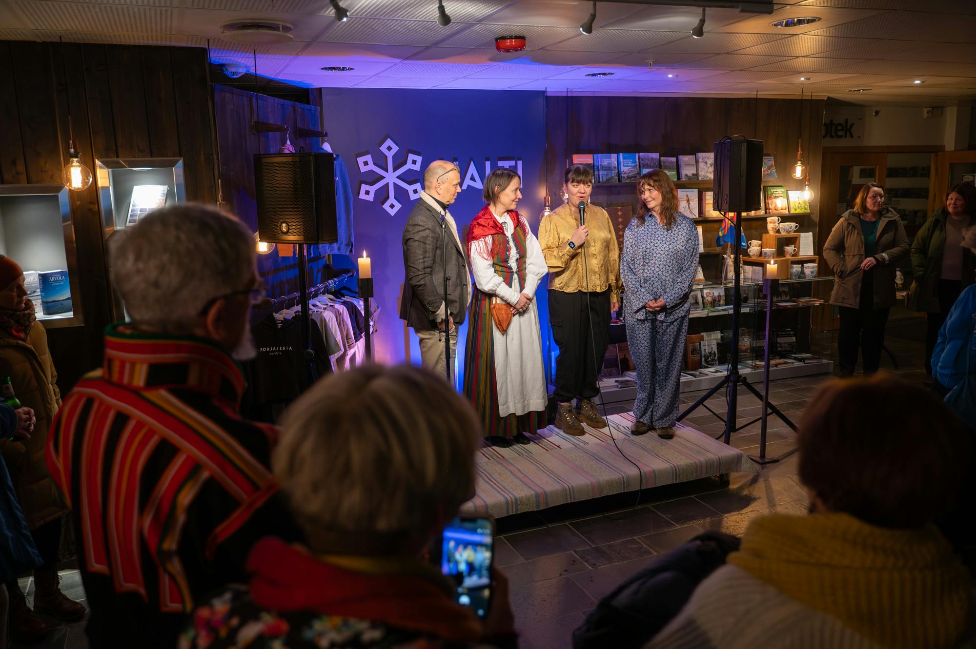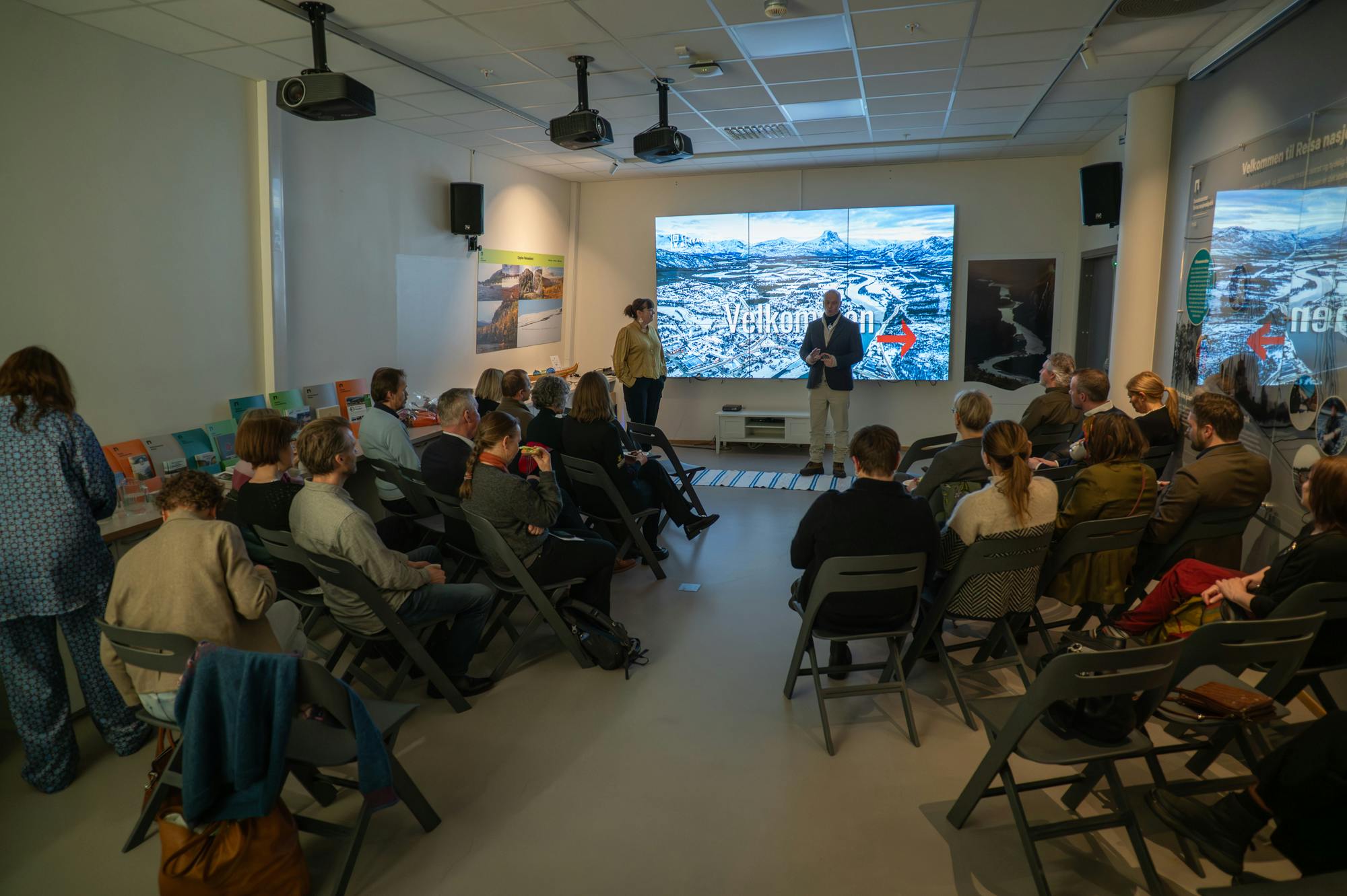 Odd Rudberg i Reisa nasjonalparksenter forteller om utstillingen "Fantastiske Reisa". Skuespillere Ida Løken Valkeapää og Lena Kristin Ellingsen helt til venstre.